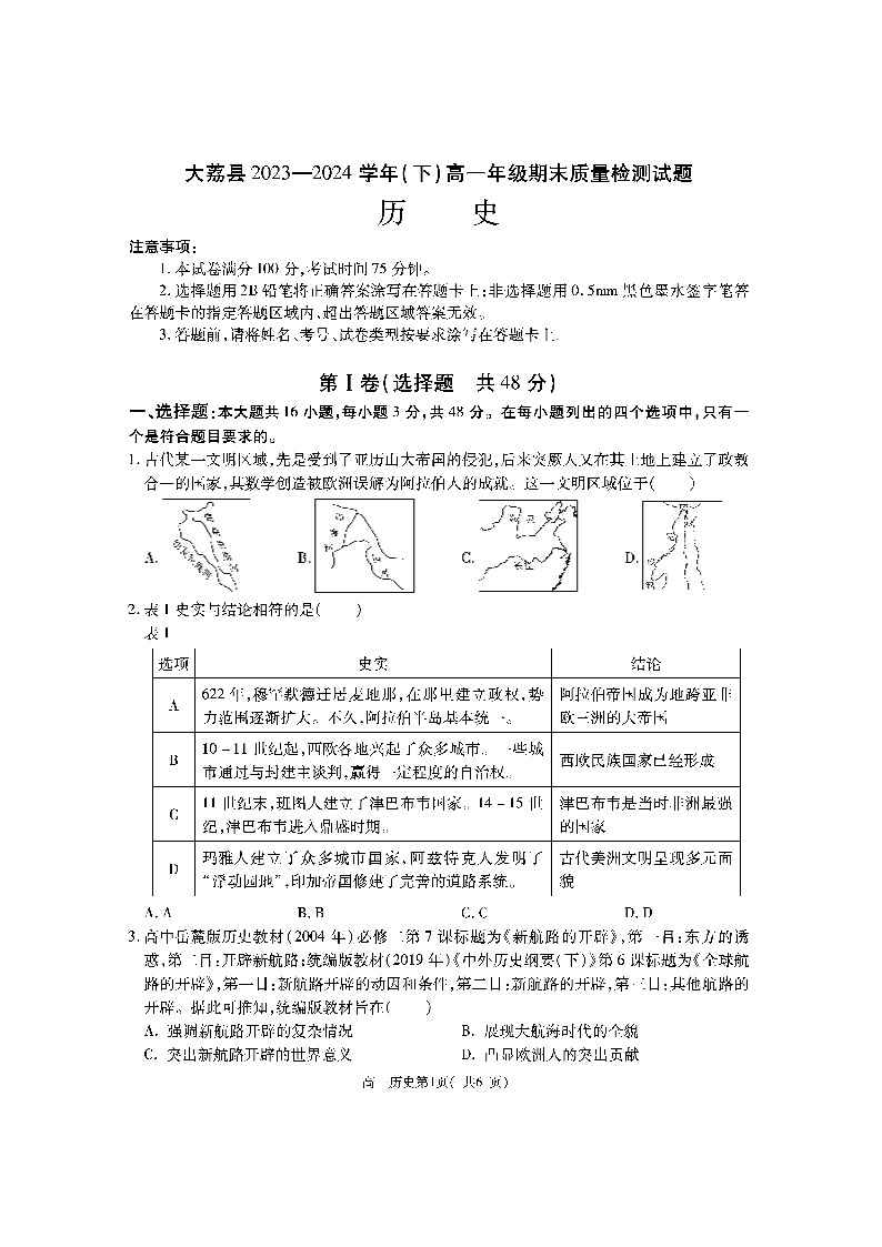 陕西省渭南市大荔县2023-2024学年高一下学期期末质量检测 历史