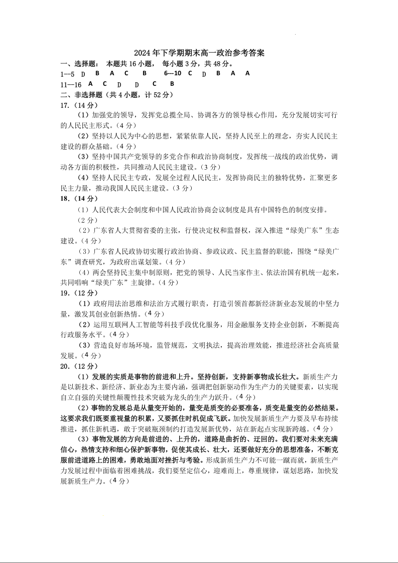 陕西省渭南市大荔县2023-2024学年高一下学期期末质量检测 政治答案