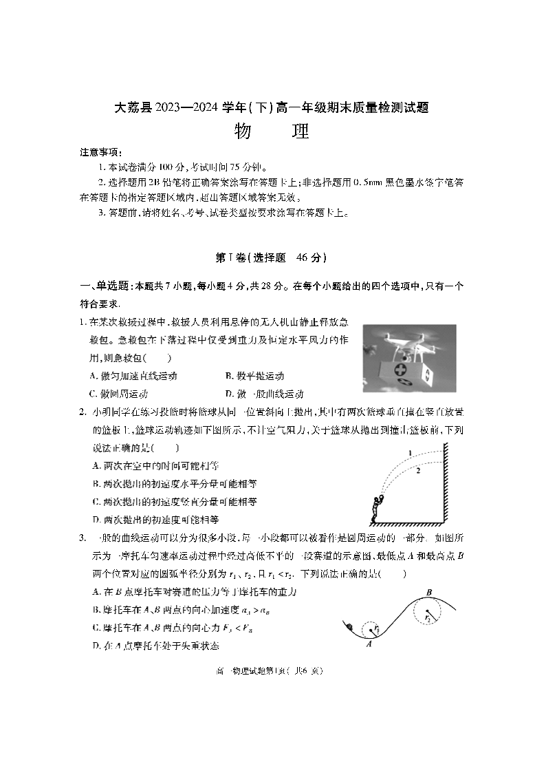 陕西省渭南市大荔县2023-2024学年高一下学期期末质量检测 物理