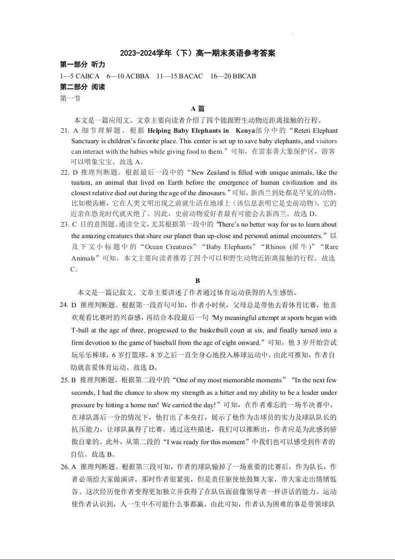 陕西省渭南市大荔县2023-2024学年高一下学期期末质量检测 英语答案