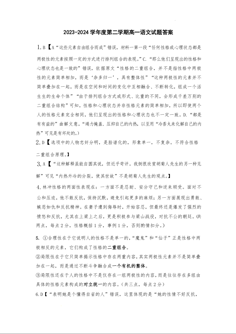 陕西省渭南市大荔县2023-2024学年高一下学期期末质量检测 语文答案
