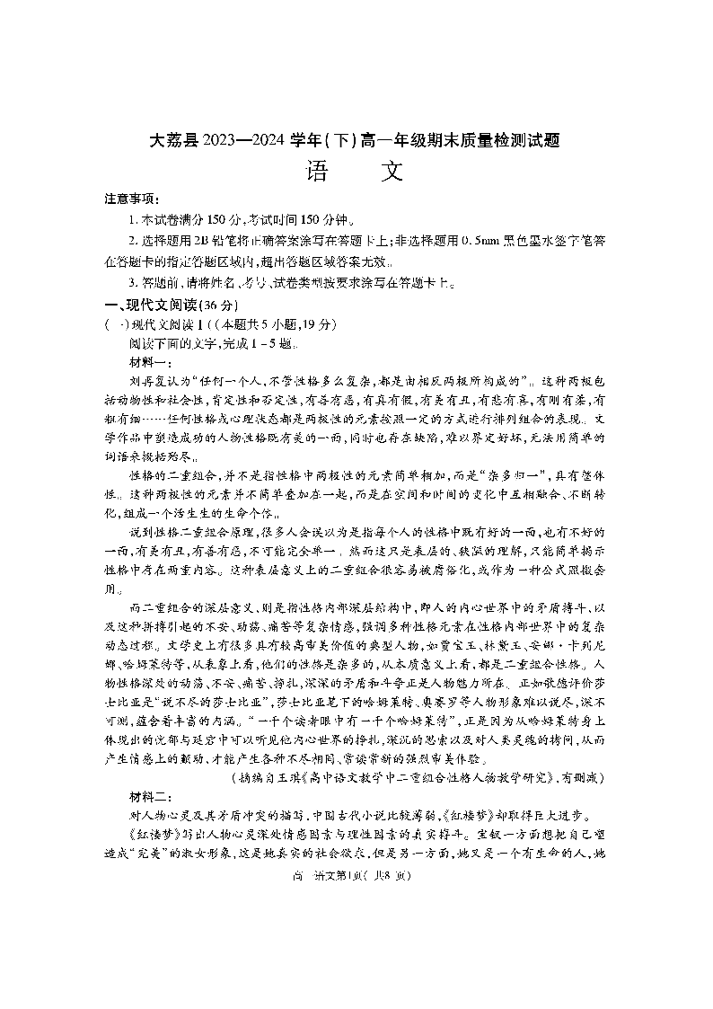 陕西省渭南市大荔县2023-2024学年高一下学期期末质量检测 语文