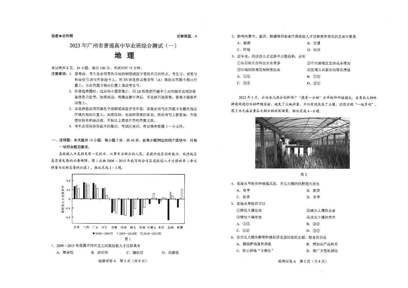 【广东卷】2023年广州市普通高中毕业班综合测试(一)地理试题