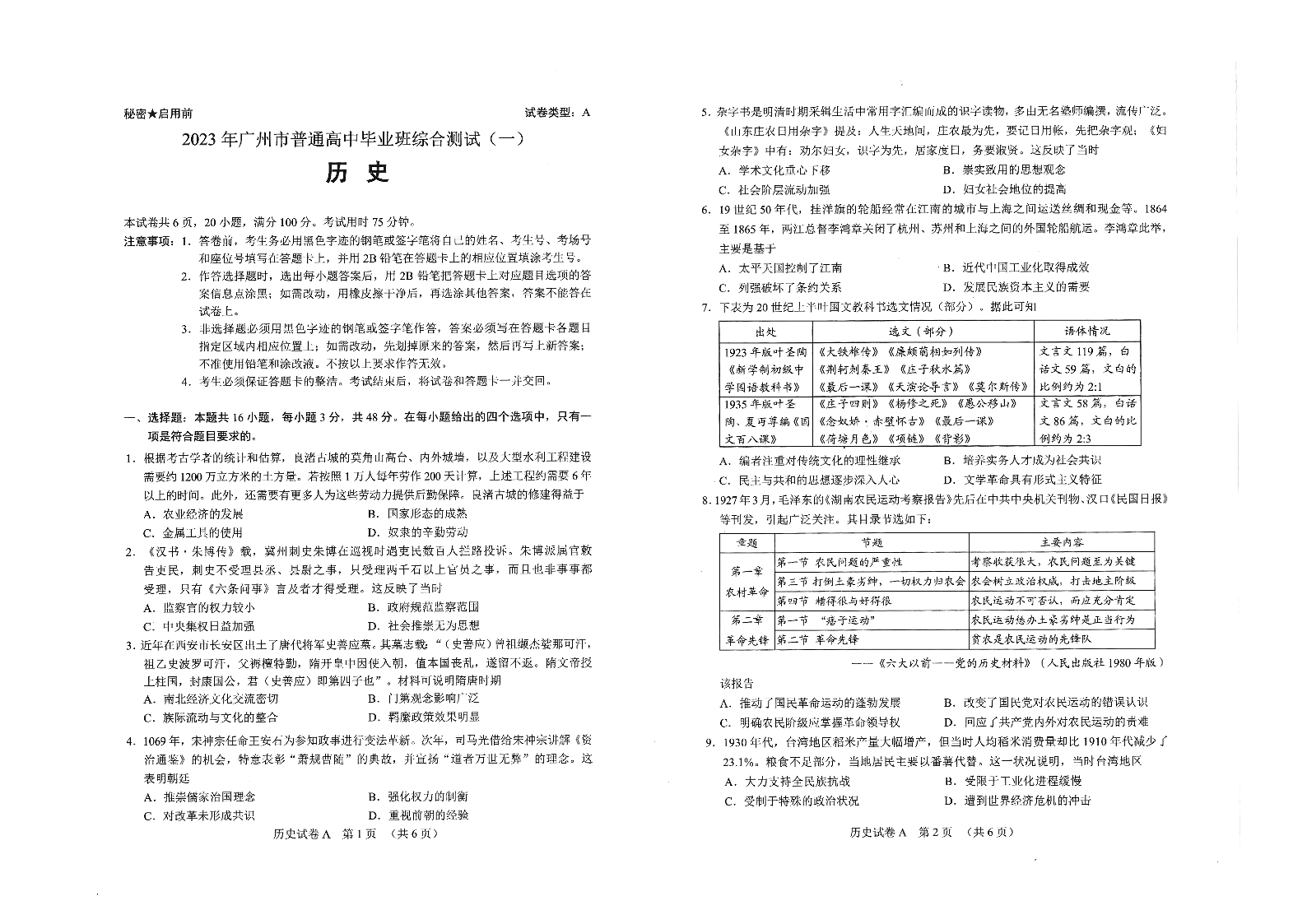 【广东卷】2023年广州市普通高中毕业班综合测试(一)历史试题