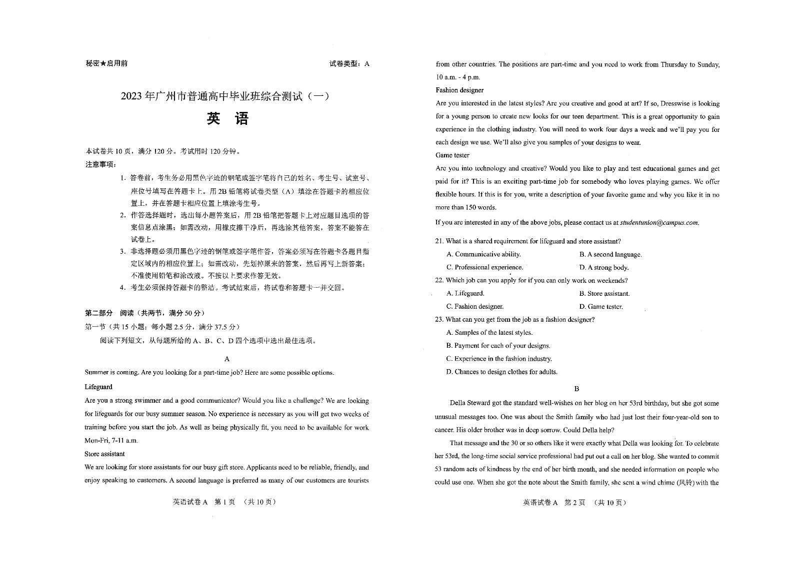 【广东卷】2023年广州市普通高中毕业班综合测试(一)英语试题