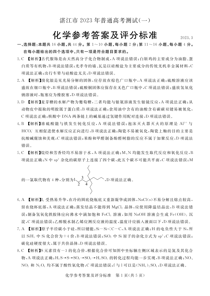 湛江市2023年普通高考测试(一)化学答案