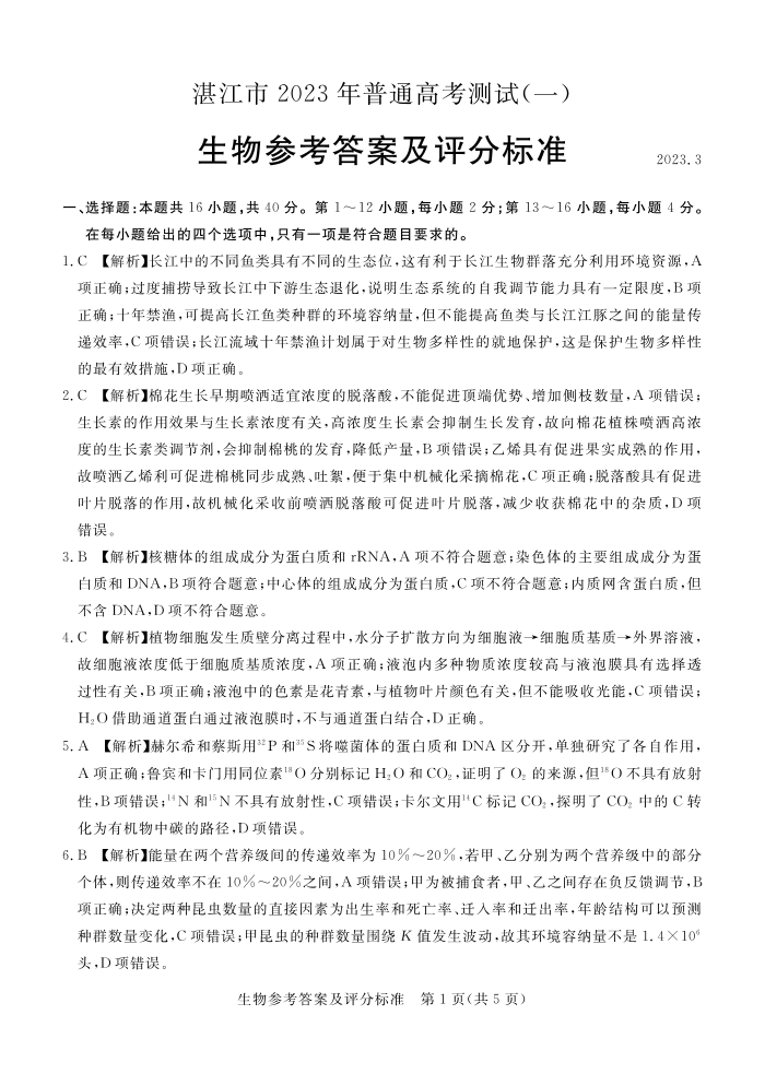 湛江市2023年普通高考测试(一)生物答案