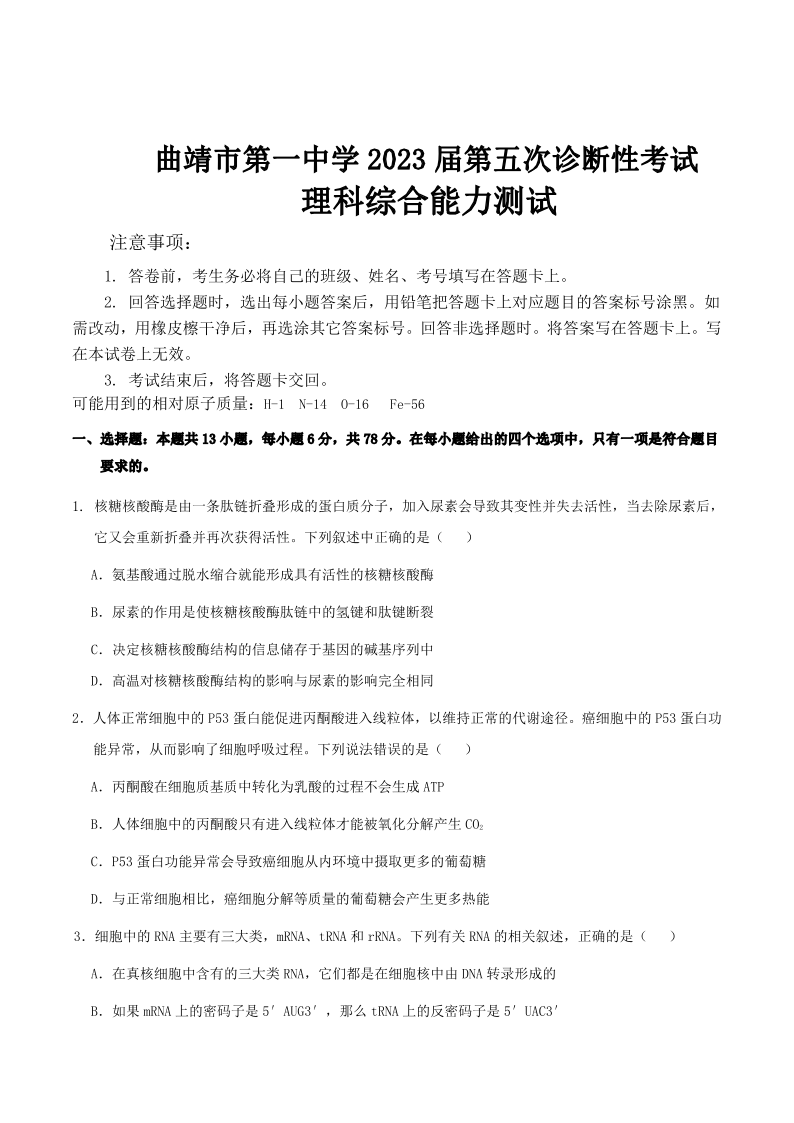 【新教材老高考】云南省曲靖市第一中学2022-2023学年高三下学期教学质量监测试卷(五)理科综合试题