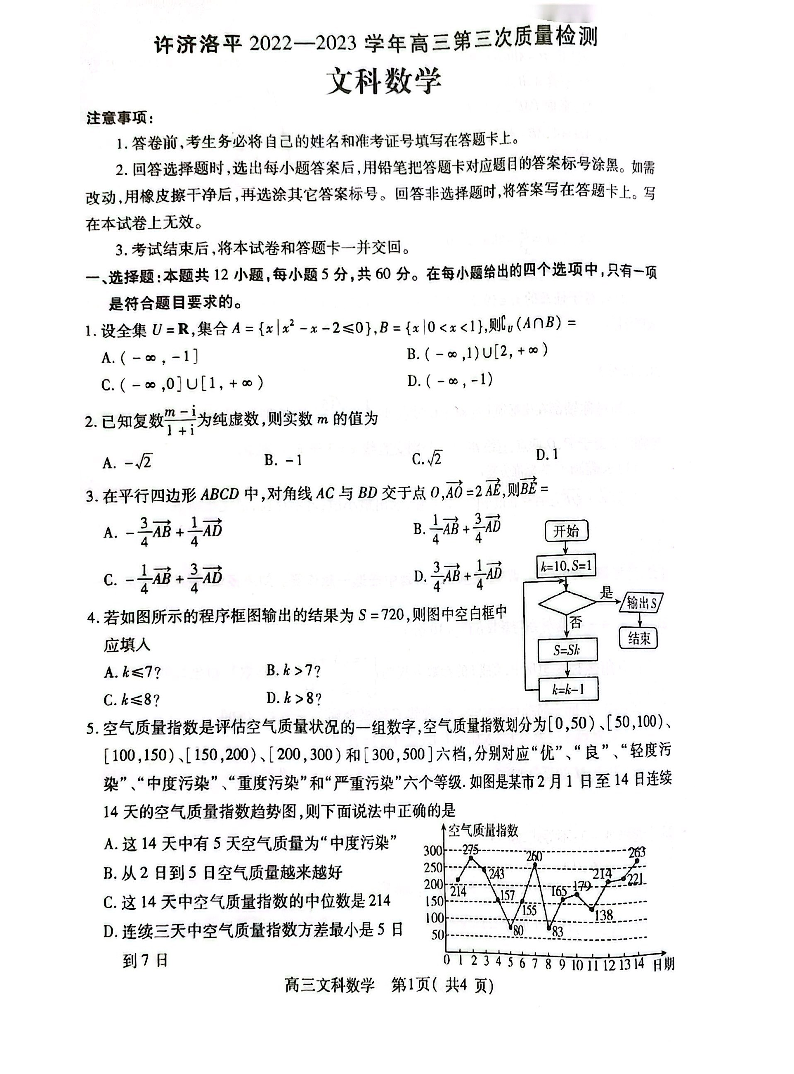 【全国乙卷】2023届河南省许济洛平四市高三第三次质量检测文数试卷