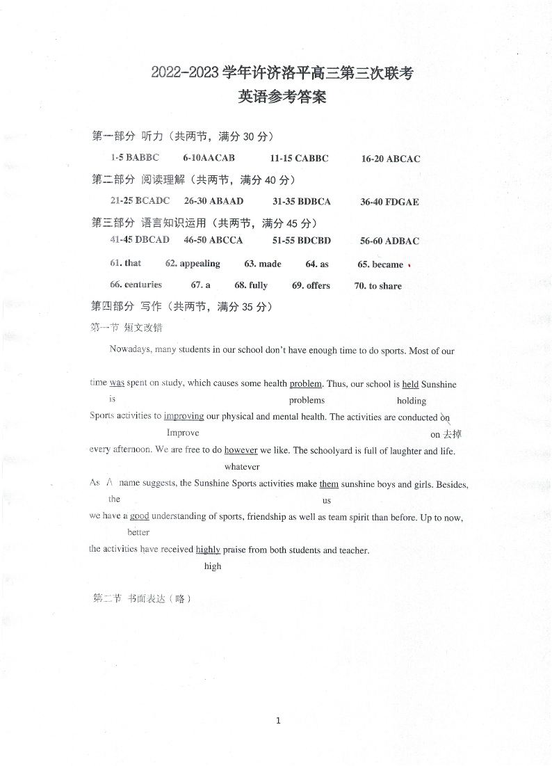 【全国乙卷】2023届河南省许济洛平四市高三第三次质量检测英语参考答案