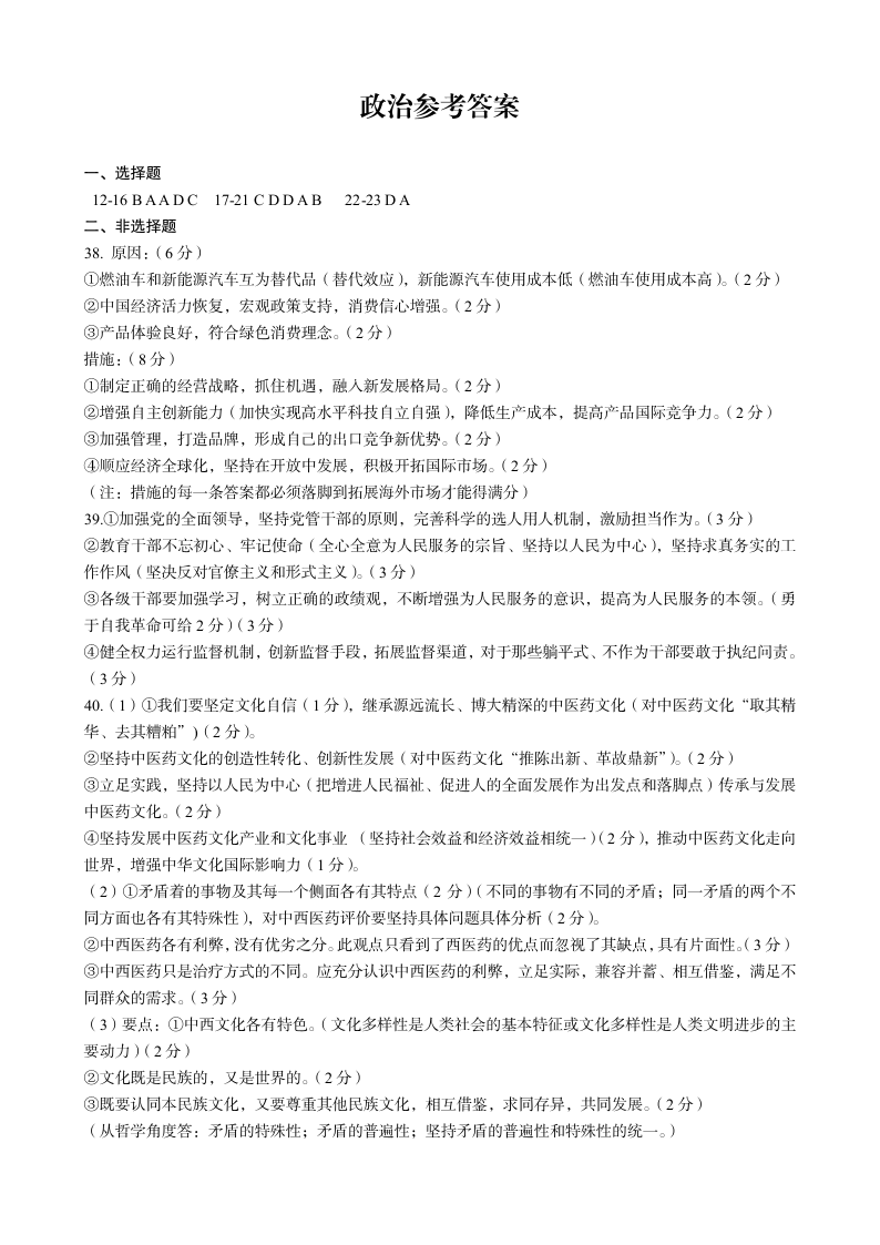 【全国乙卷】开封市2023届高三年级第二次模拟考试高三政治答案