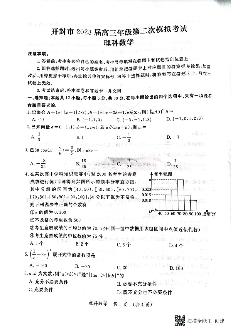 【全国乙卷】开封市2023届高三年级第二次模拟考试高三理科数学试卷