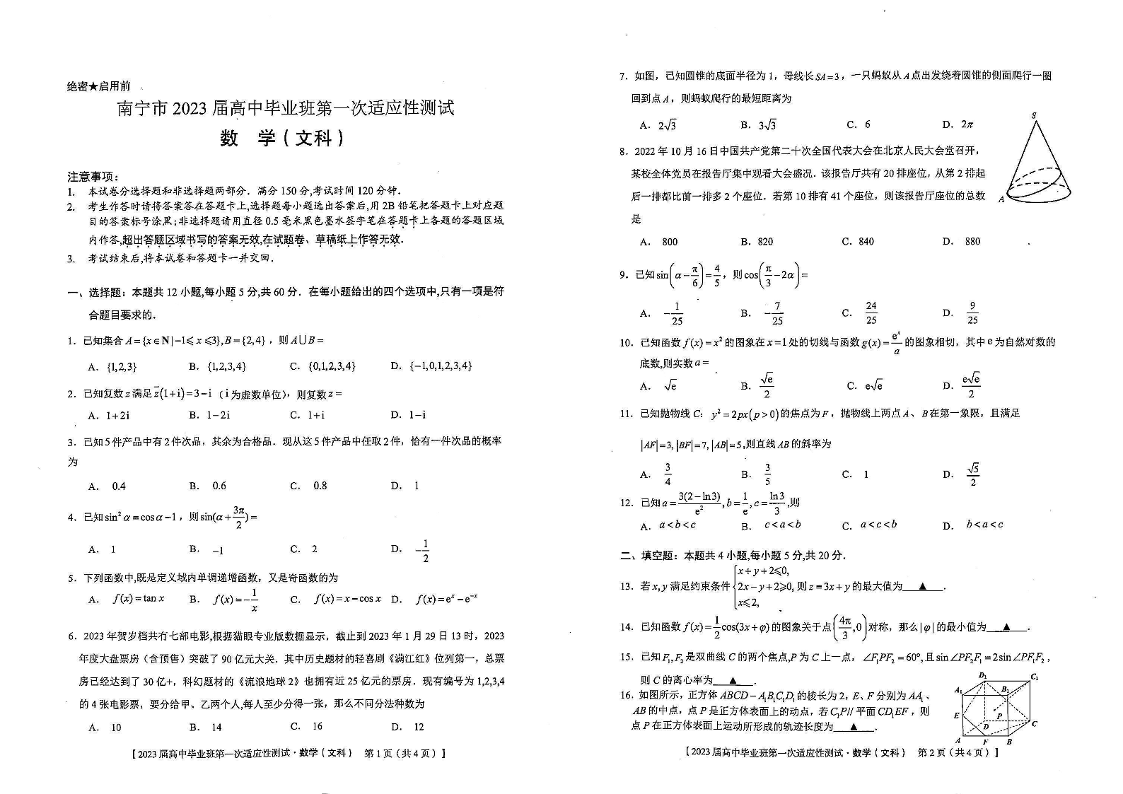 广西南宁市2023届高中毕业班第一次适应性测试数学(文科)试题