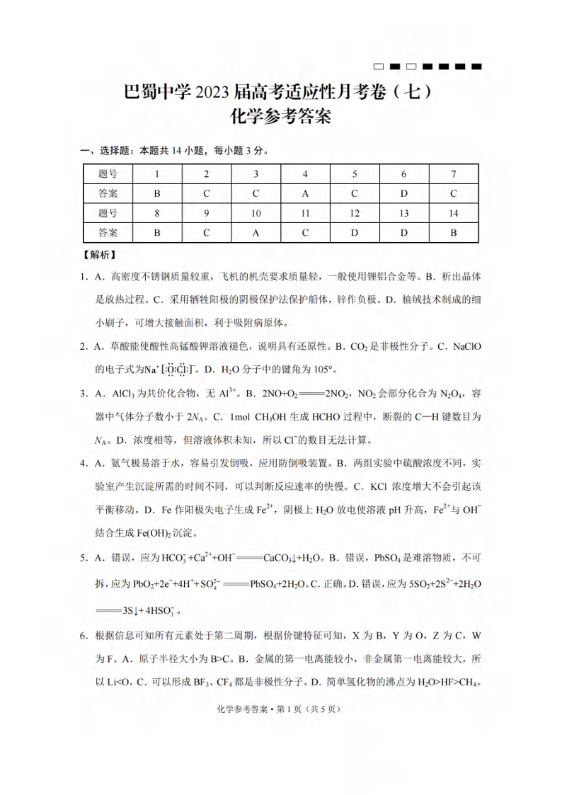 巴蜀中学2023届高考适应性月考卷(七)丨化学答案