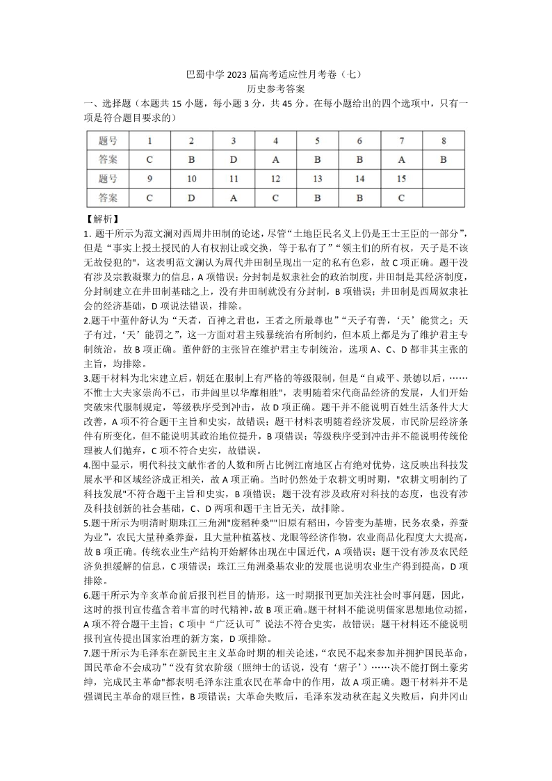 巴蜀中学2023届高考适应性月考卷(七)丨历史答案