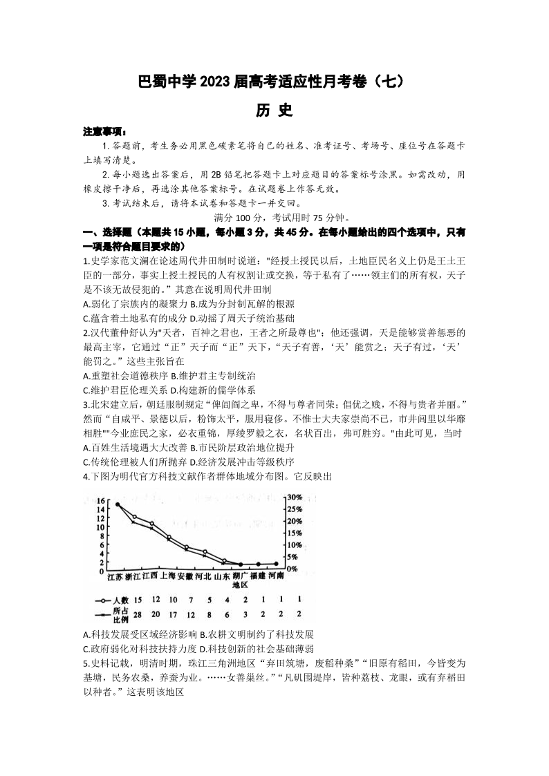 巴蜀中学2023届高考适应性月考卷(七)丨历史