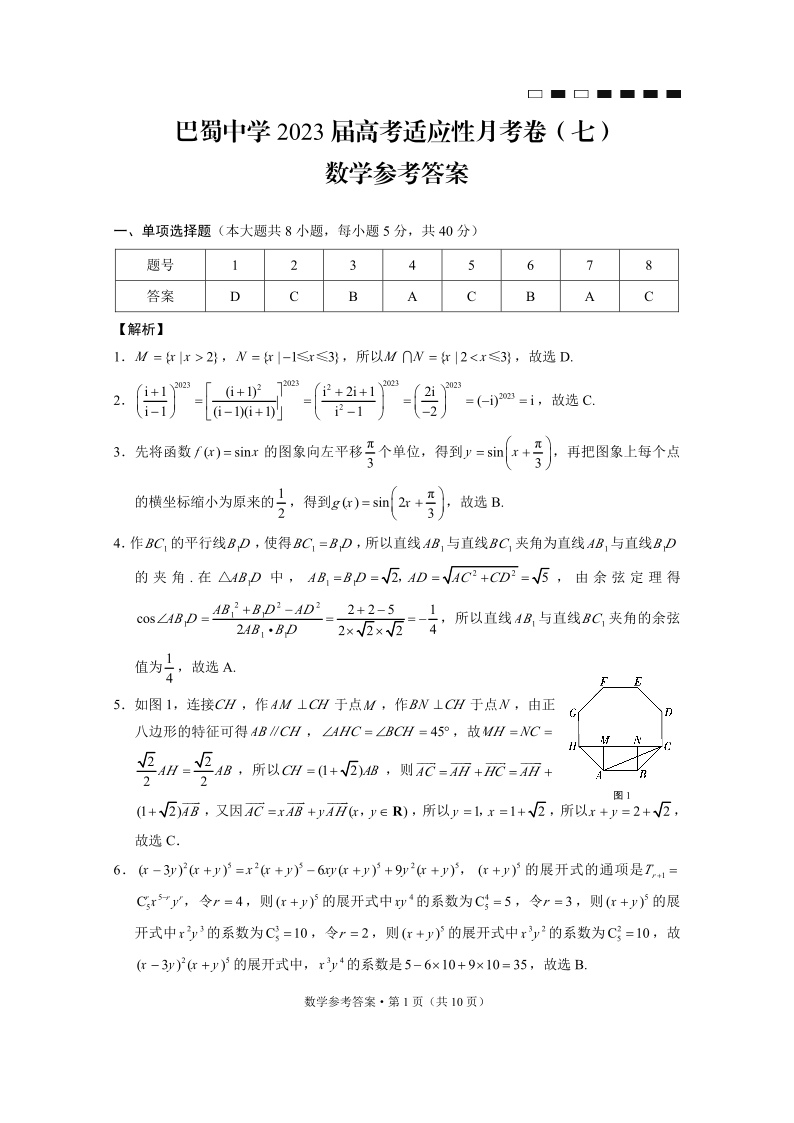 巴蜀中学2023届高考适应性月考卷(七)丨数学答案
