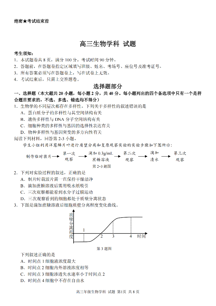 【浙江卷】浙江省金丽衢十二校、七彩阳光等校2022-2023学年高三下学期3月联考生物试题