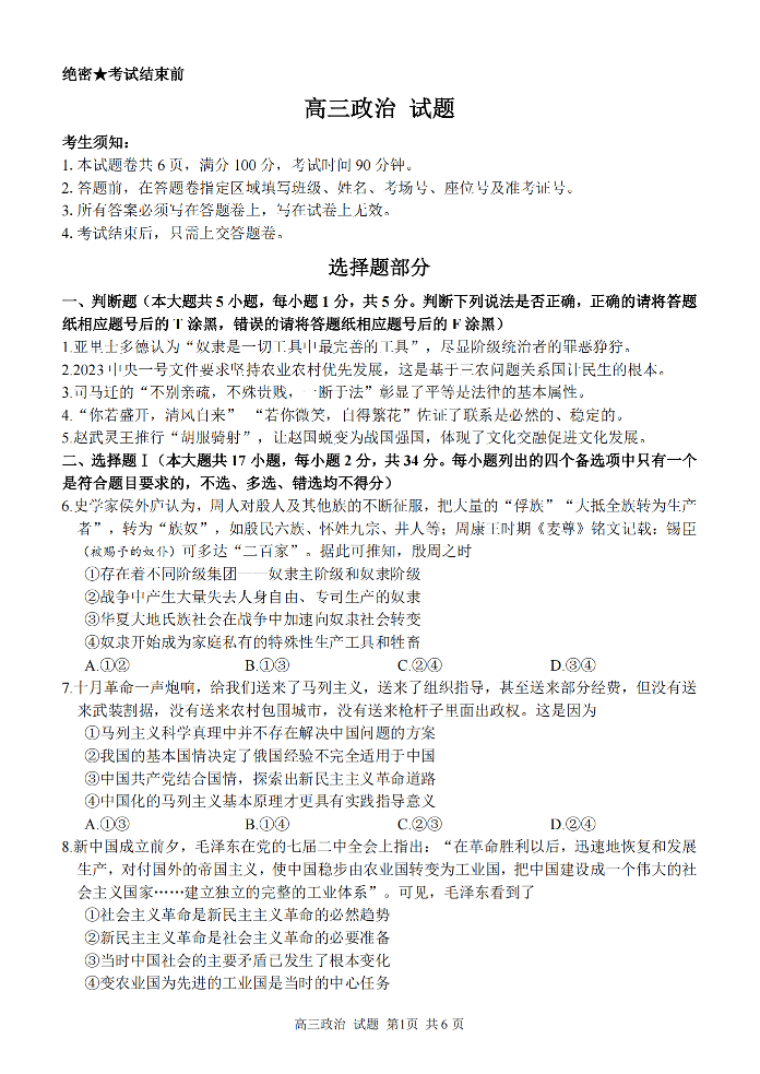 【浙江卷】浙江省金丽衢十二校、七彩阳光等校2022-2023学年高三下学期3月联考政治试题