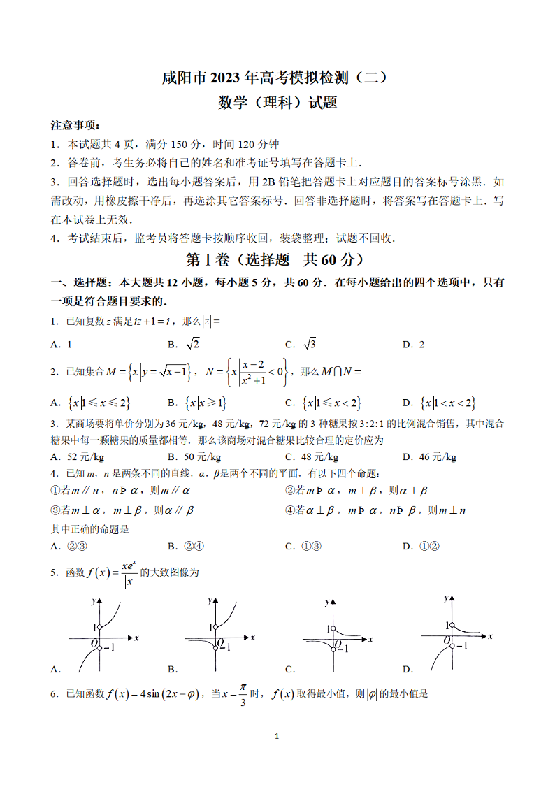 陕西省咸阳市2023年高考模拟检测(二)理科数学