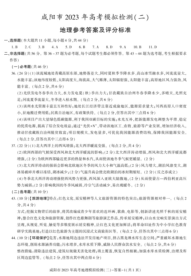 陕西省咸阳市2023年高考模拟检测(二)文综答案