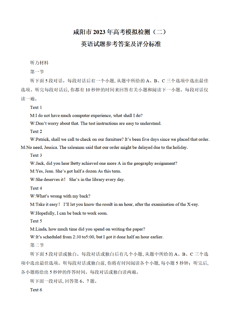 陕西省咸阳市2023年高考模拟检测(二)英语答案