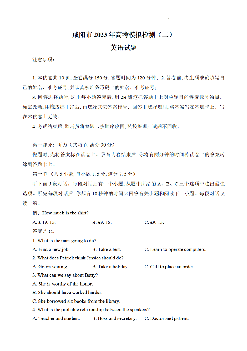 陕西省咸阳市2023年高考模拟检测(二)英语