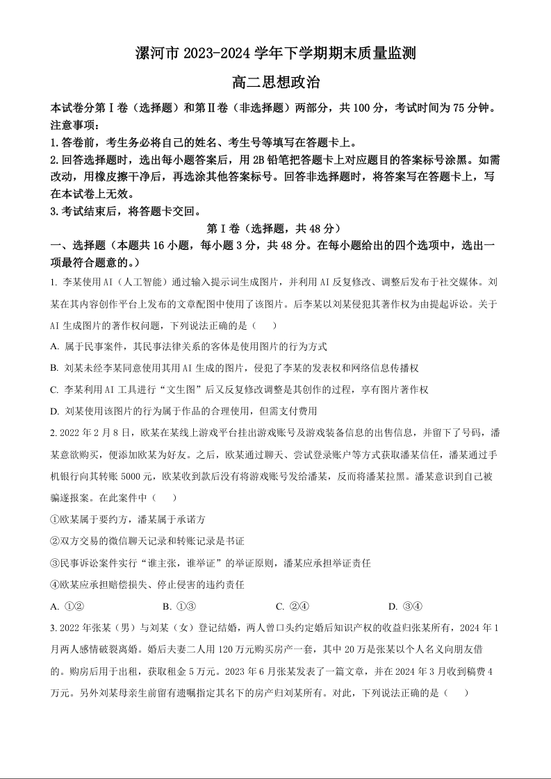 河南省漯河市2023-2024学年高二下学期期质量监测考试 政治