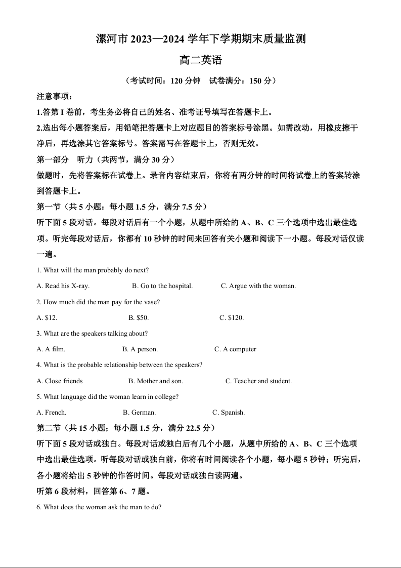 河南省漯河市2023-2024学年高二下学期期质量监测考试 英语