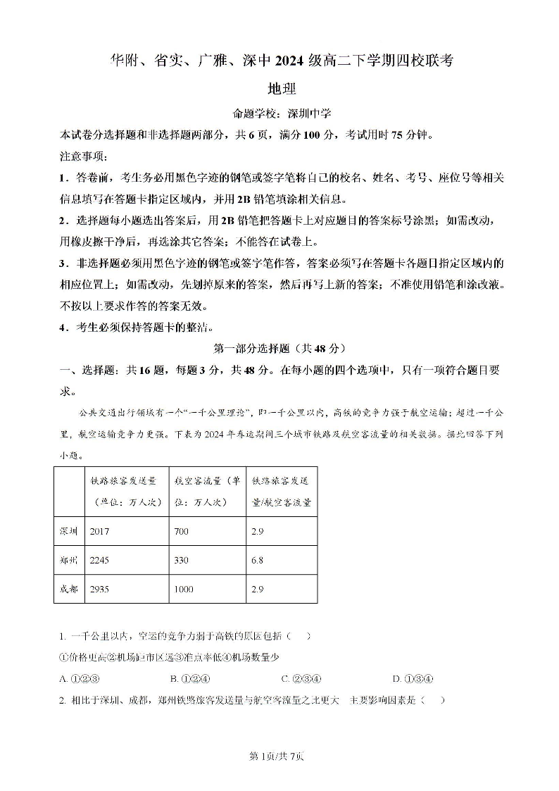 广东省四校(华附、省实、广雅、深中)2023-2024学年高二下学期期末联考 地理