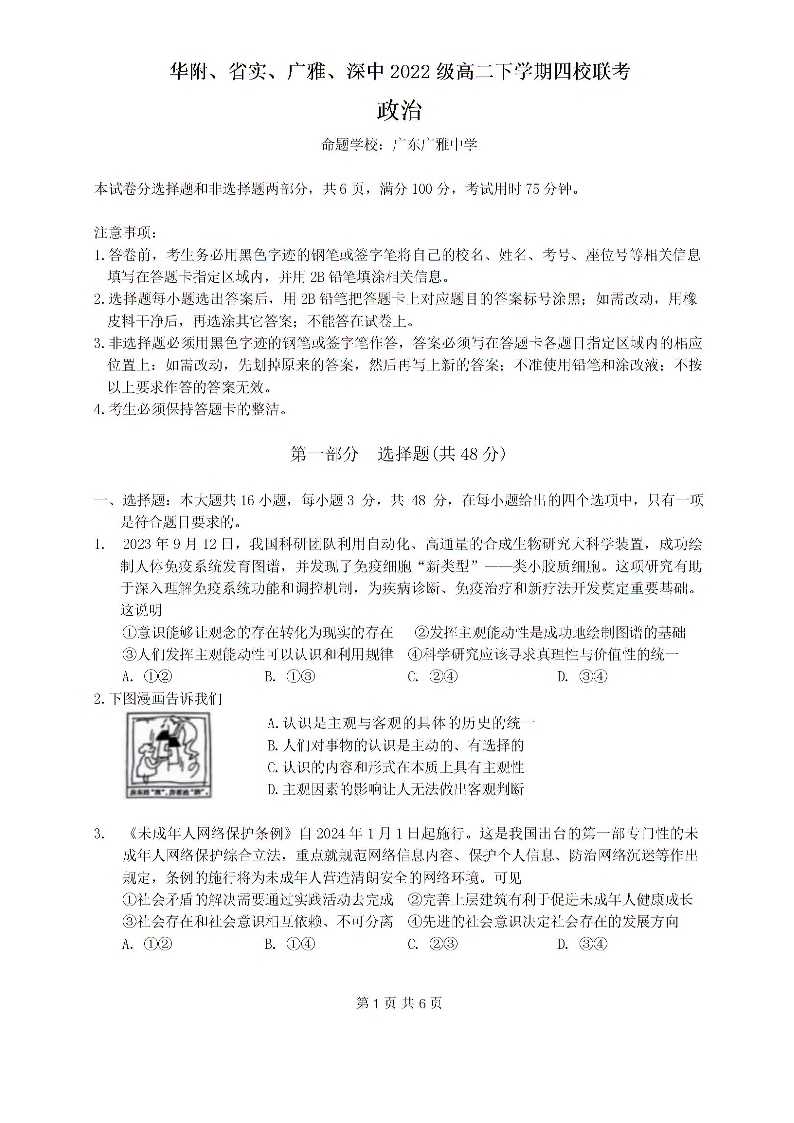 广东省四校(华附、省实、广雅、深中)2023-2024学年高二下学期期末联考 政治