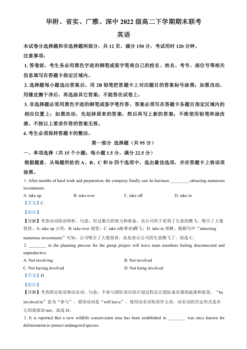 广东省四校(华附、省实、广雅、深中)2023-2024学年高二下学期期末联考 英语