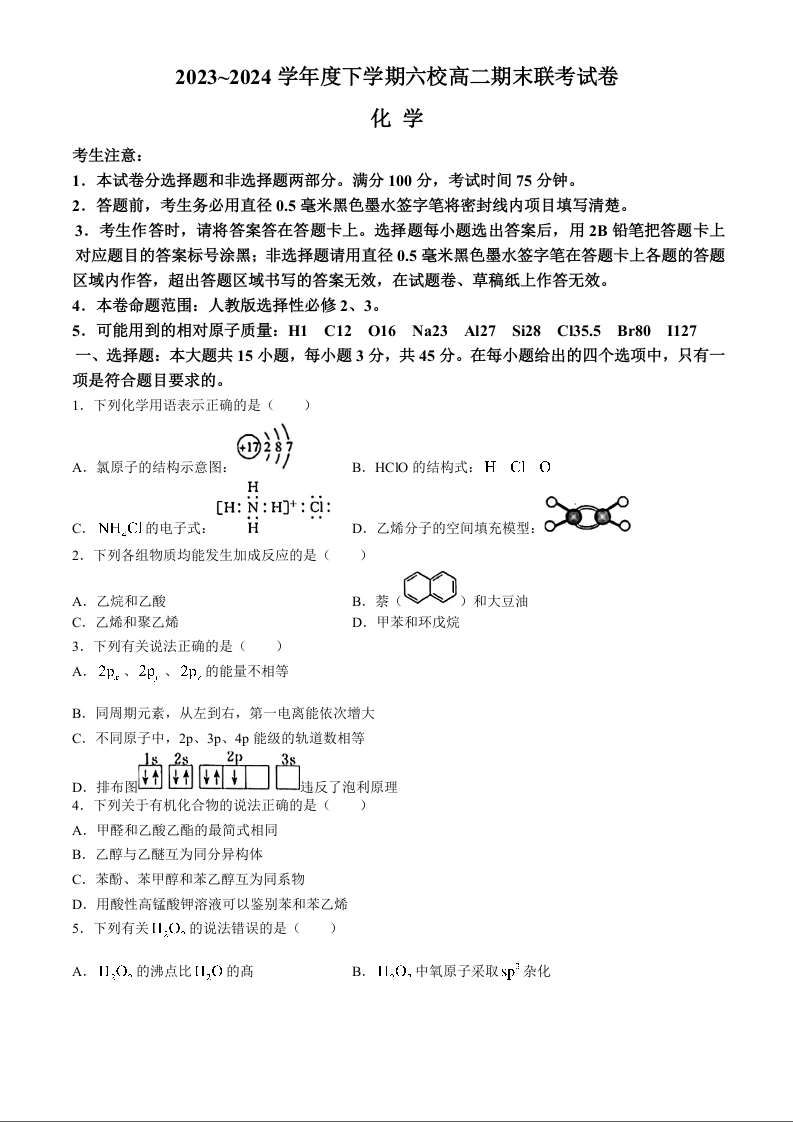 黑龙江省哈尔滨市六校2023-2024学年高二下学期期末联考试题 化学