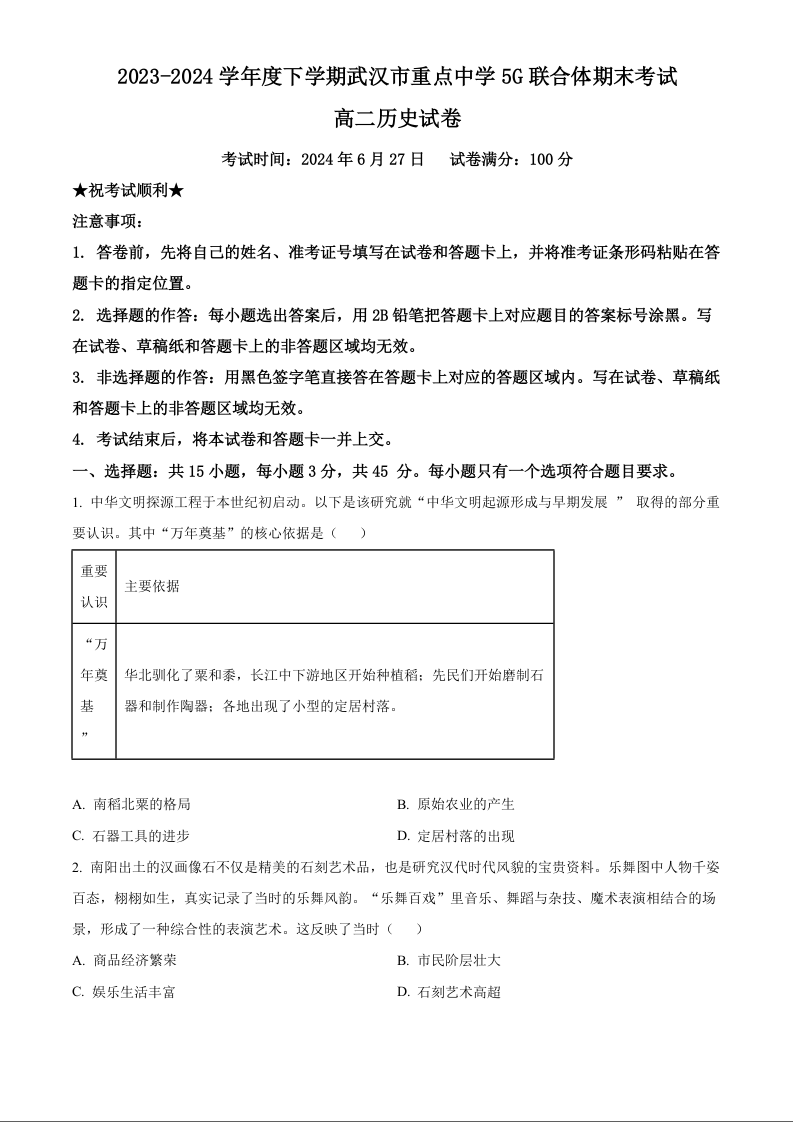 湖北省武汉市重点中学5G联合体2023-2024学年高二下学期期末考试 历史
