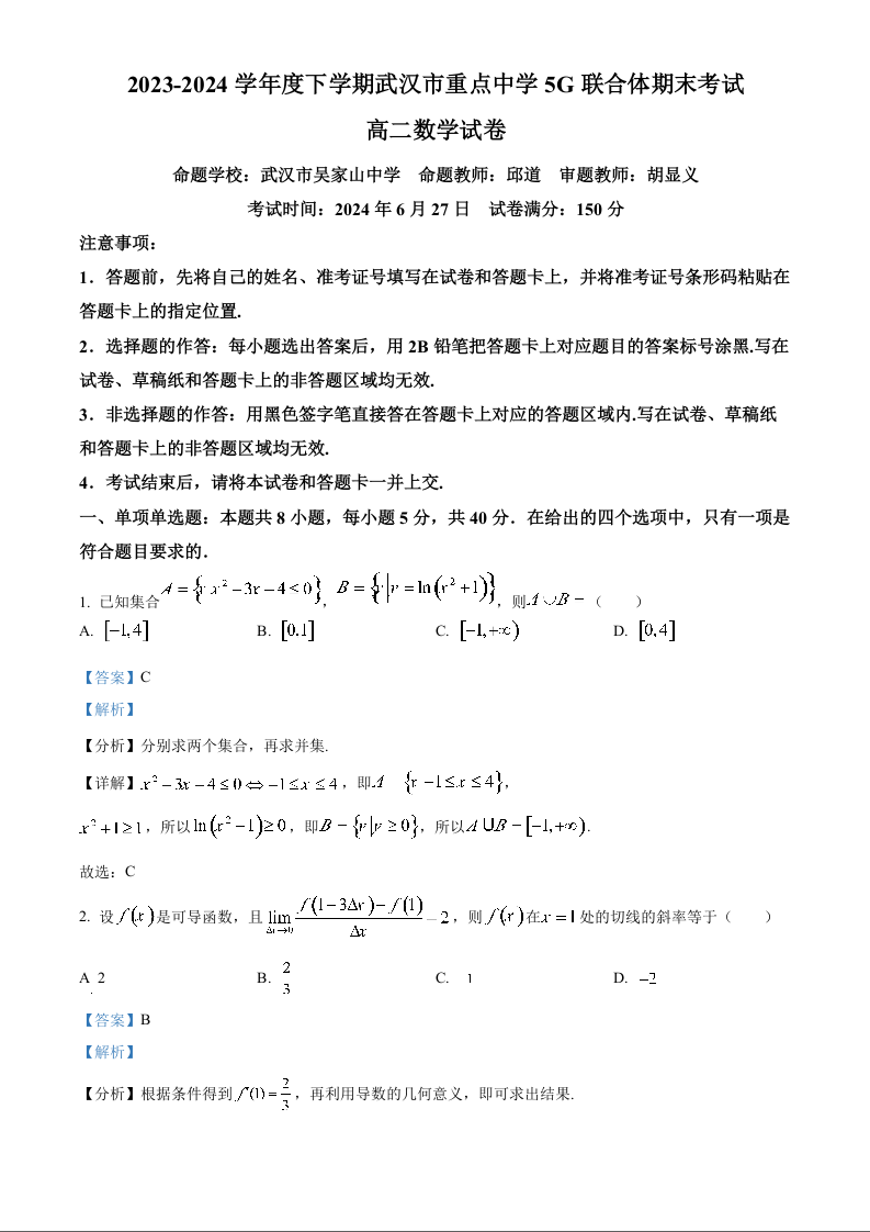 湖北省武汉市重点中学5G联合体2023-2024学年高二下学期期末考试 数学答案