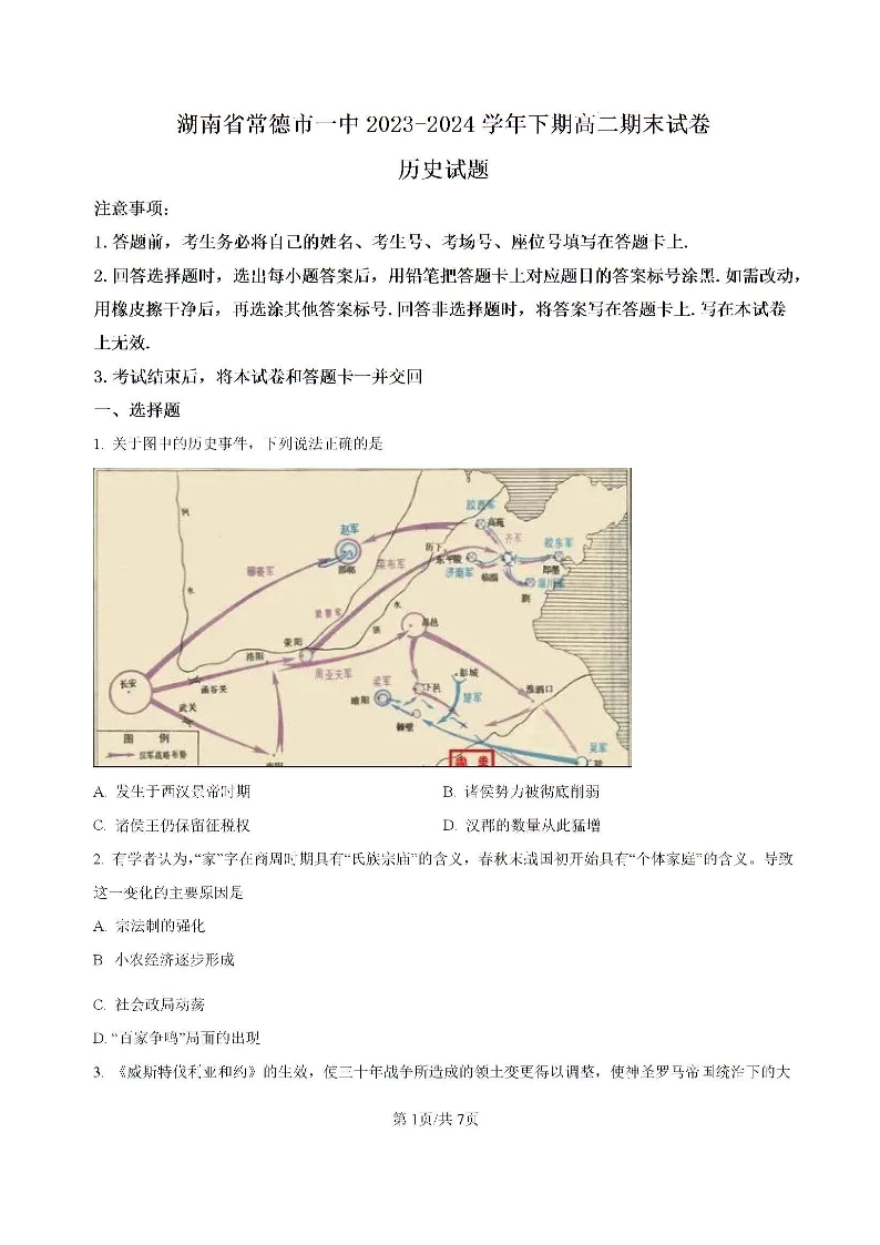 湖南省常德市第一中学2023-2024学年高二下学期期末考试 历史