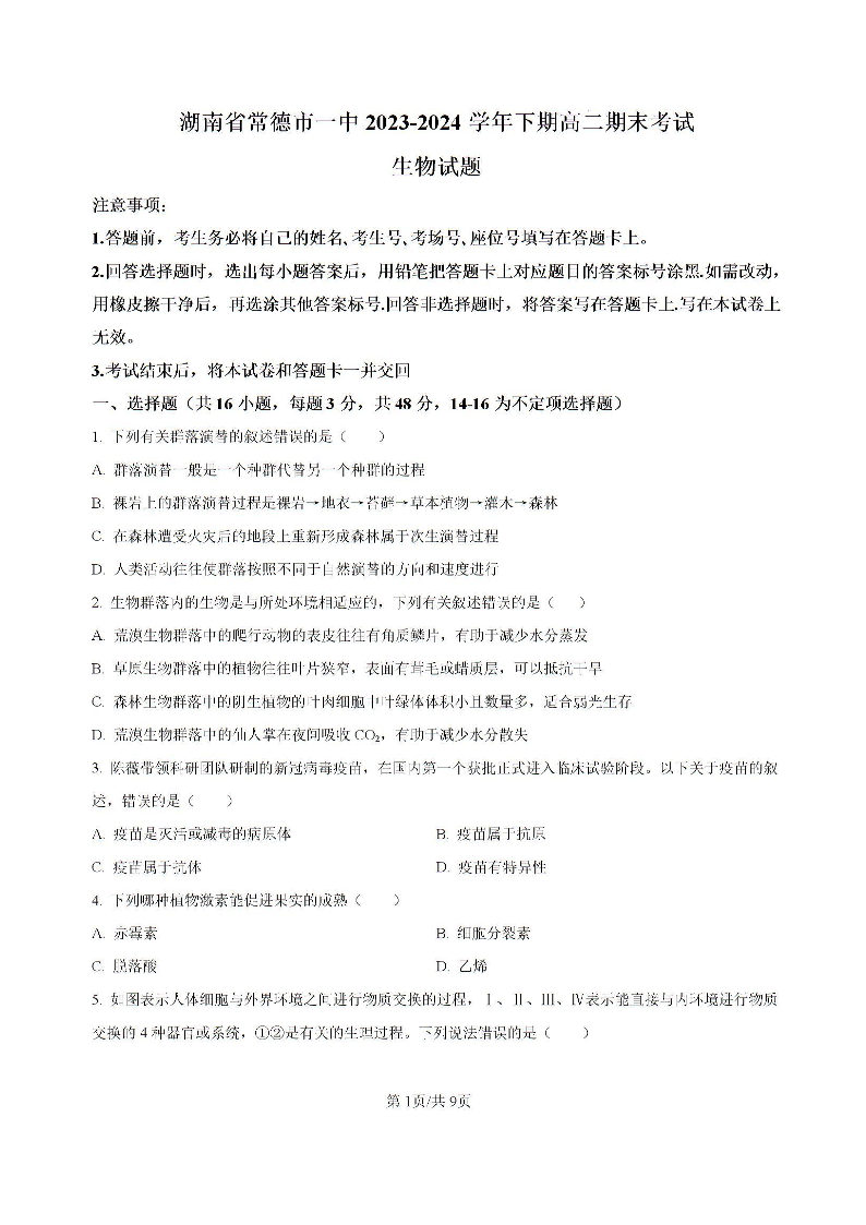 湖南省常德市第一中学2023-2024学年高二下学期期末考试 生物