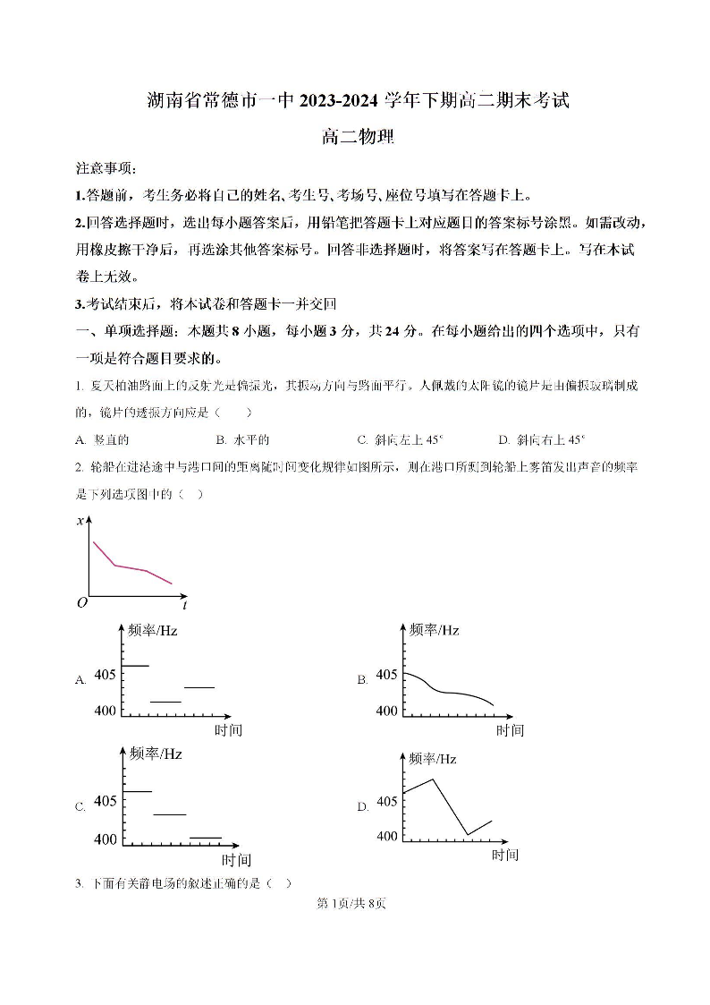 湖南省常德市第一中学2023-2024学年高二下学期期末考试 物理
