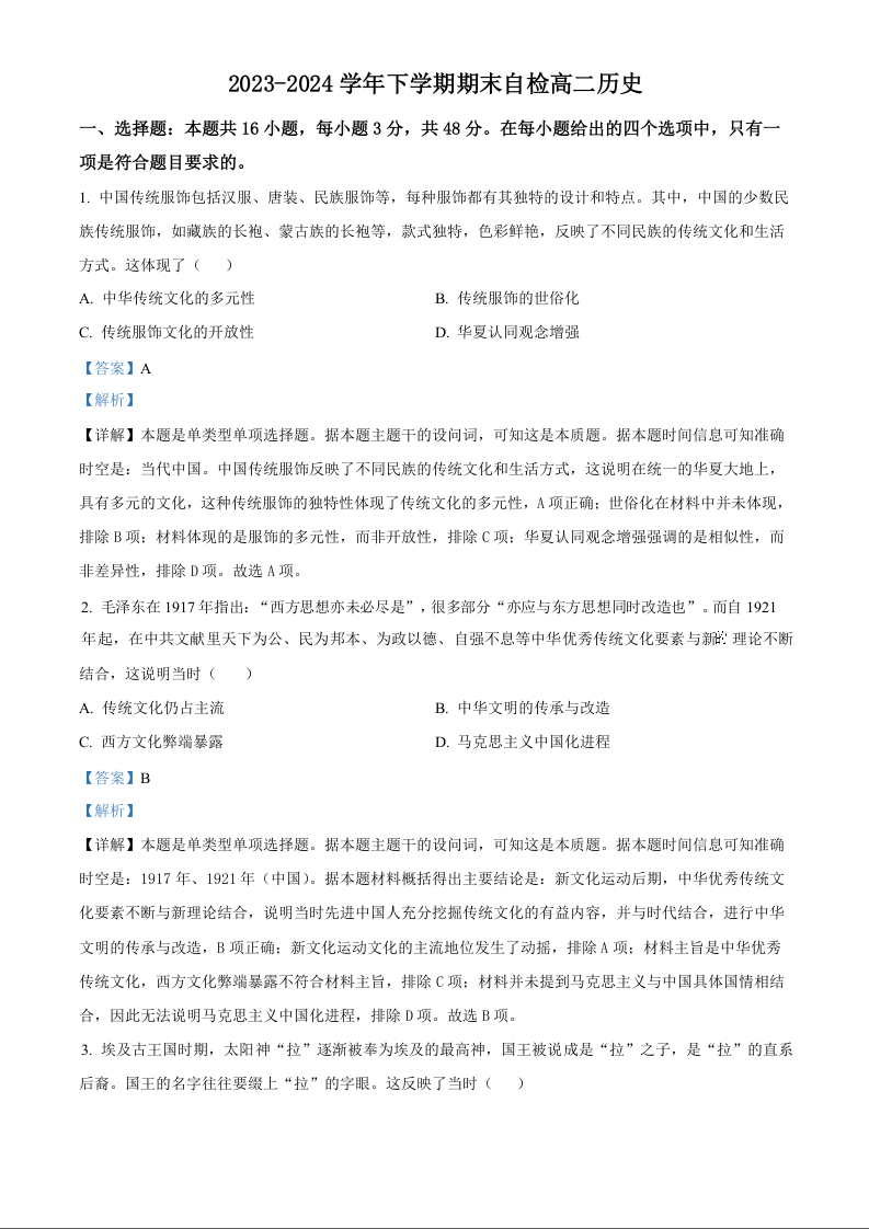 湖南省益阳市安化县两校联考2023-2024学年高二下学期7月期末考试 历史答案