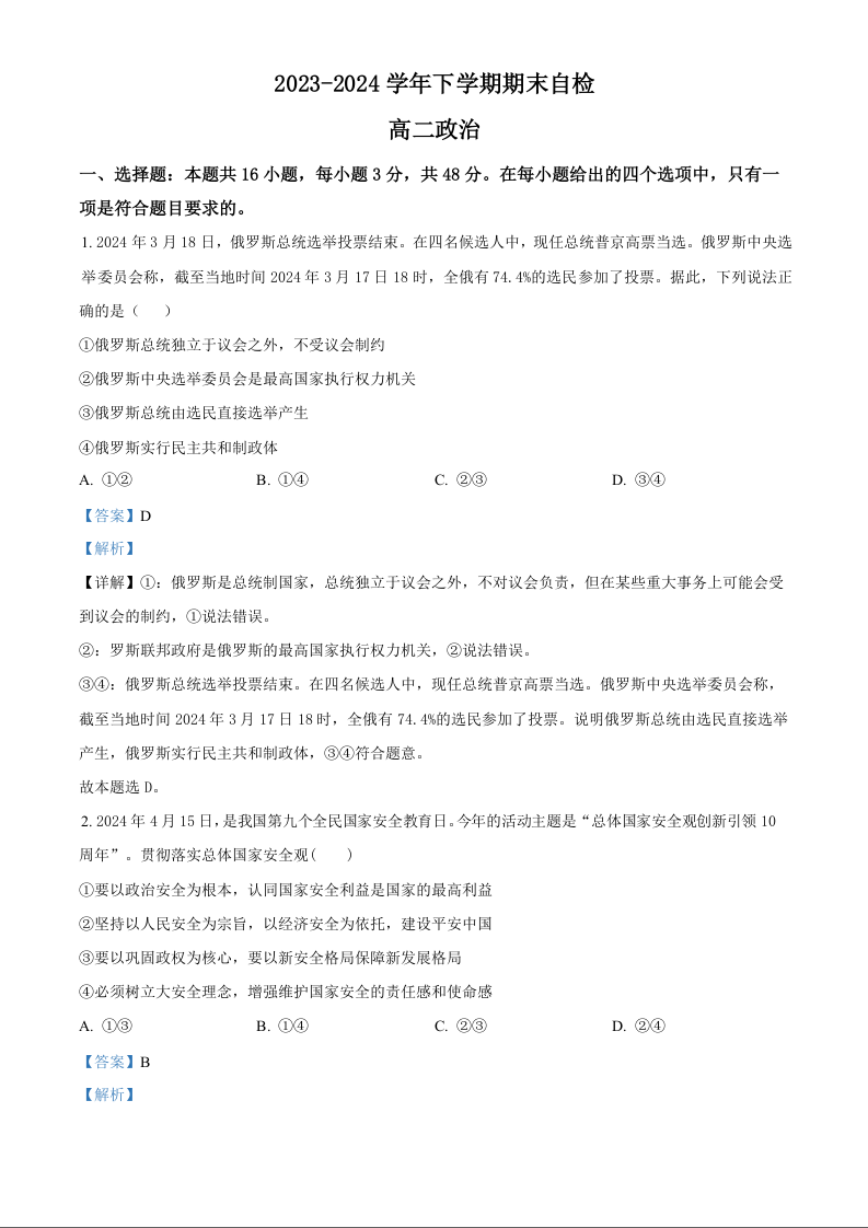 湖南省益阳市安化县两校联考2023-2024学年高二下学期7月期末考试 政治答案