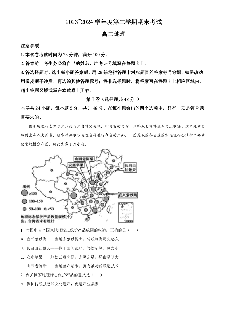 辽宁省锦州市2023-2024学年高二下学期期末考试 地理