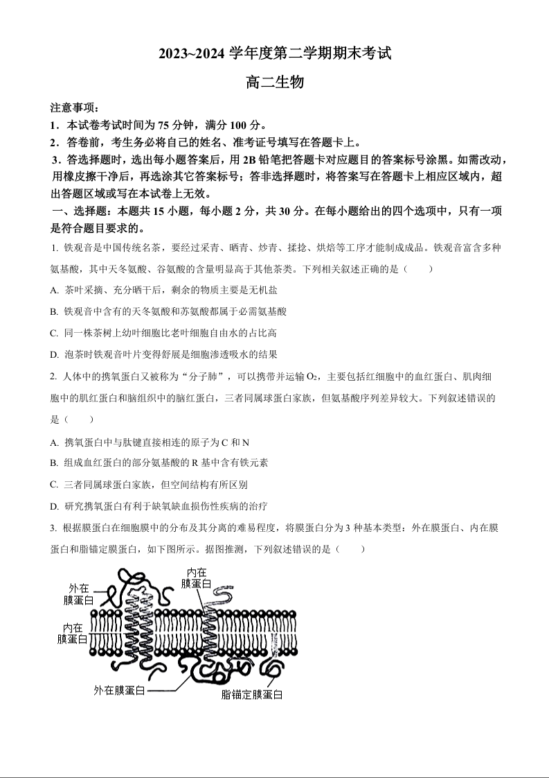 辽宁省锦州市2023-2024学年高二下学期期末考试 生物
