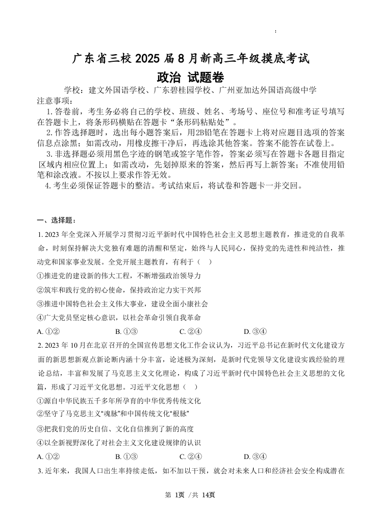 广东省三校2024-2025学年高三上学期开学考试 政治