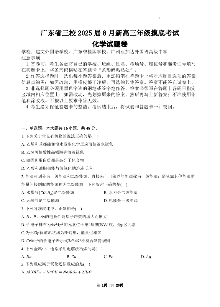 广东省三校2024-2025学年高三上学期开学考试 化学