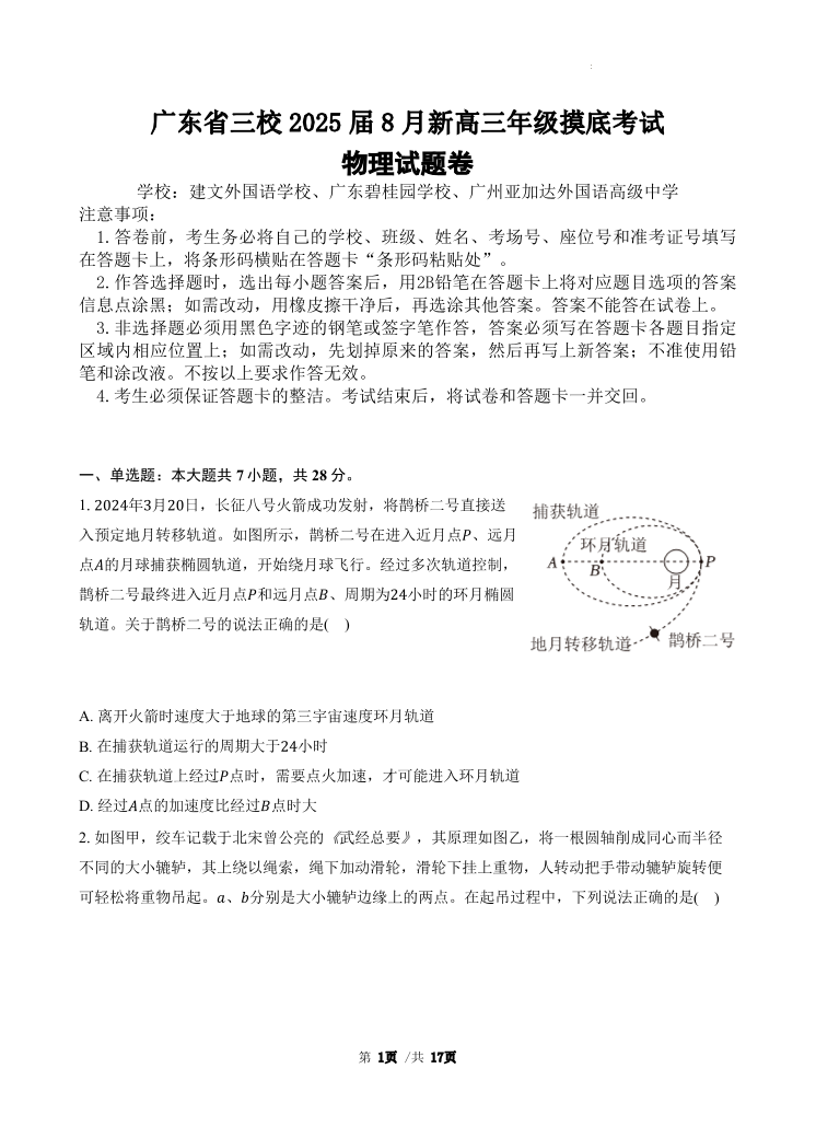 广东省三校2024-2025学年高三上学期开学考试 物理