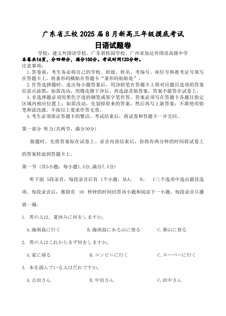 广东省三校2024-2025学年高三上学期开学考试 日语