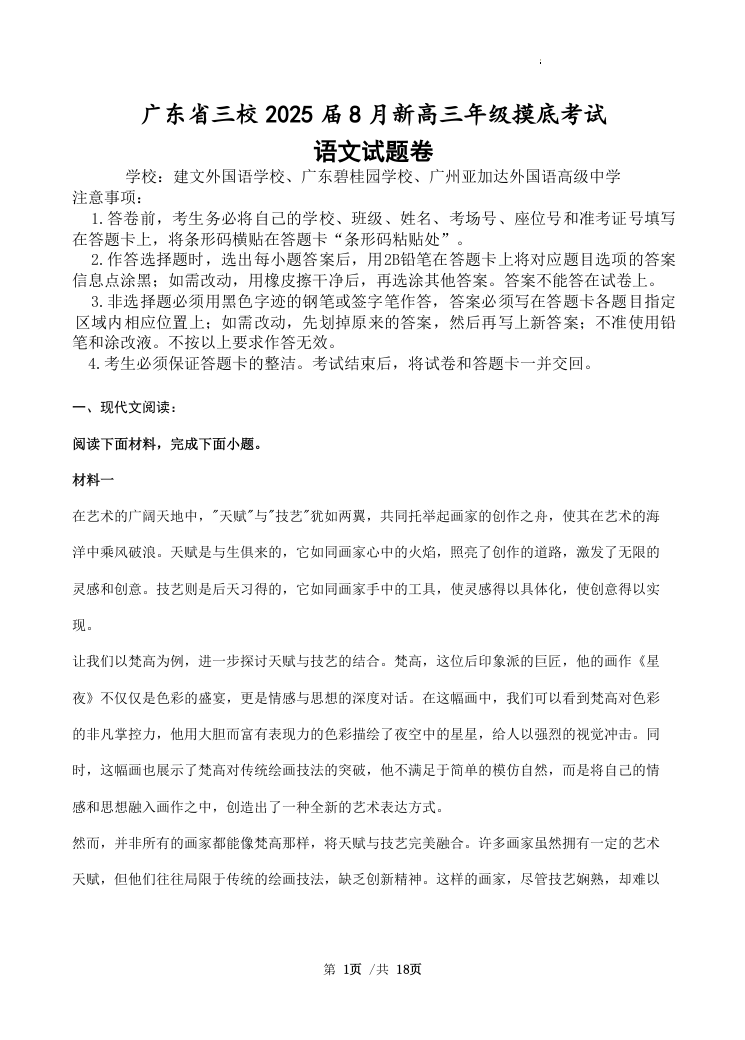 广东省三校2024-2025学年高三上学期开学考试 语文