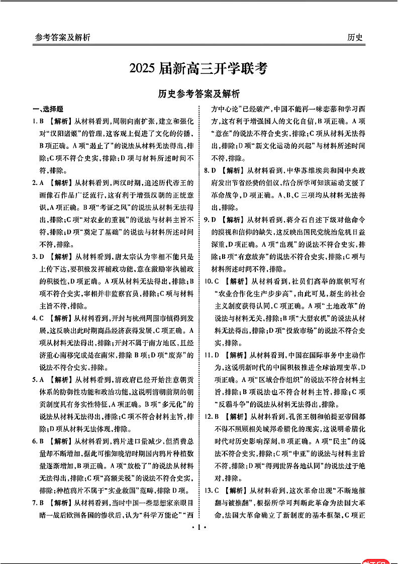 2025届广东衡水金卷新高三8月开学联考 历史答案