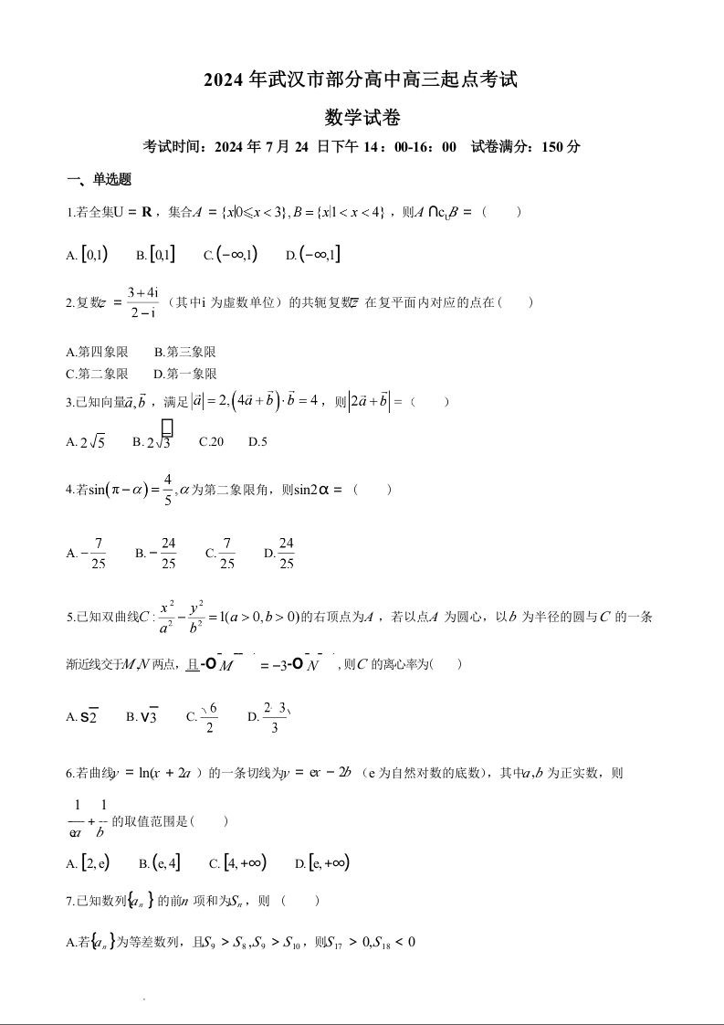 湖北省武汉市硚口区2024-2025学年高三上学期起点考试暨7月质量检测 数学