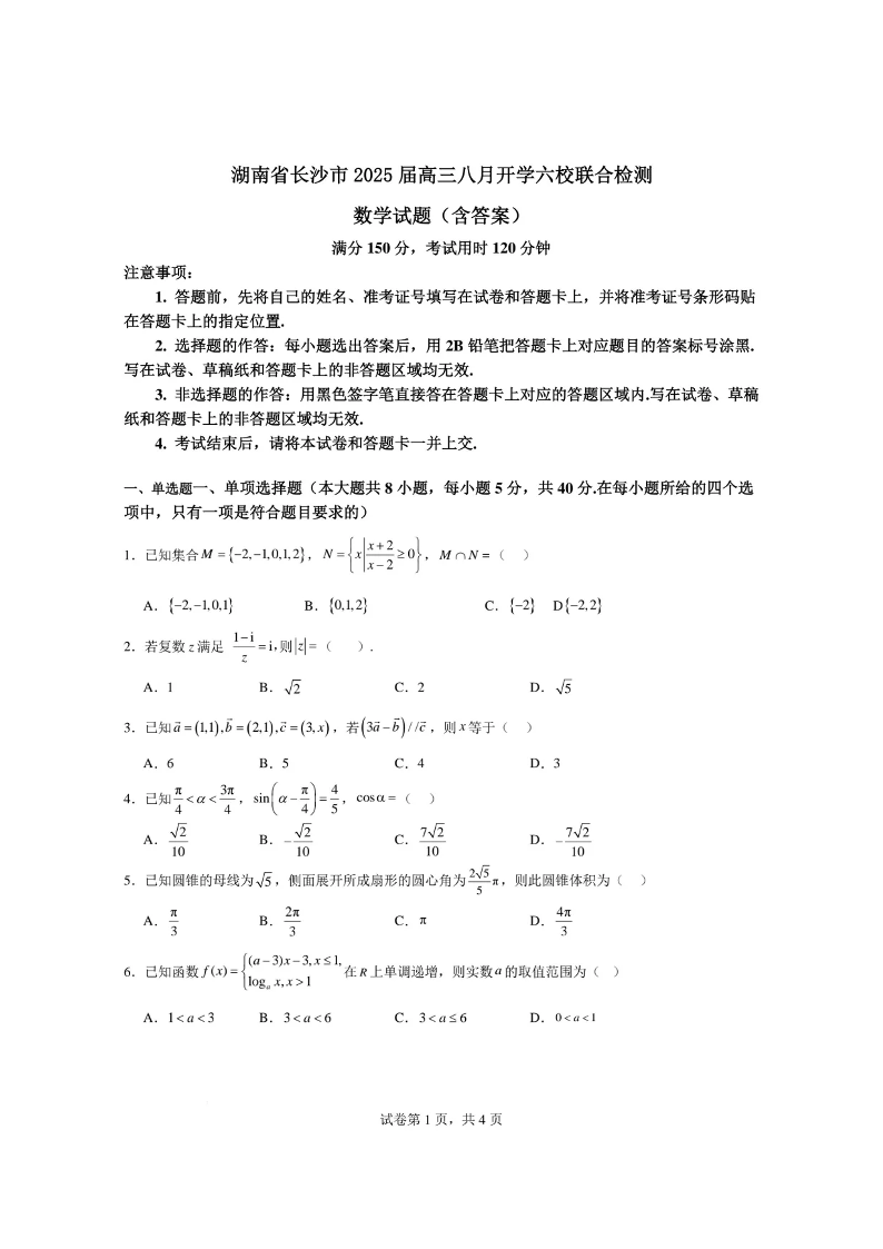 湖南省长沙市2025届高三年级上学期8月开学六校联合检测考试 数学